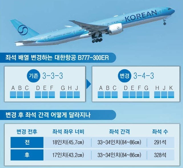 B777-300ER 기종 11대의 이코노미 좌석 배열을 기존 3-3-3에서 3-4-3으로 변경 추진. 공급석은 늘지만 좌석 좌우 간격은 1인치(2.6㎝) 줄어들게 됨.(매경)