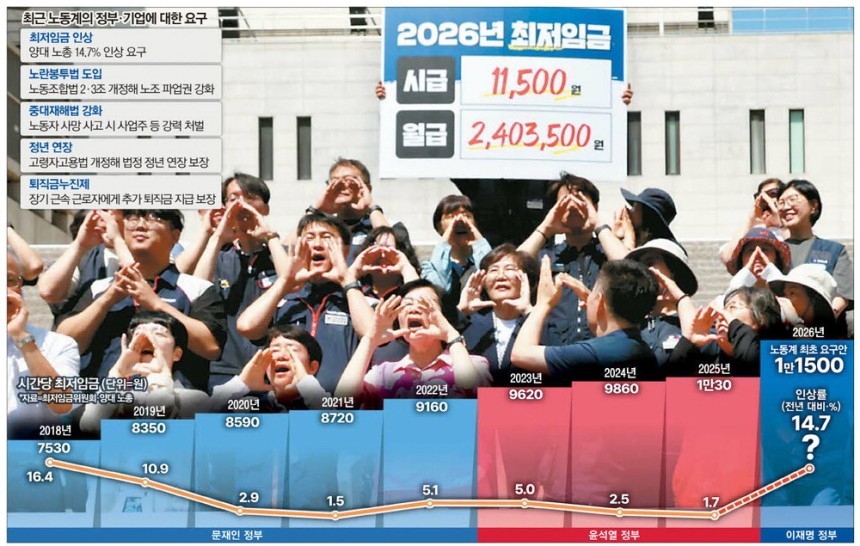 2. 양대 노총, 내년 ‘최저임금 1만 1500원’ 요구 → 노동계 ‘14.7% 인상’ 요구안 제시. 월급으로는 2,403,500원. 지난해 최초 요구안(12,600원)보다 낮지만, 올해 최저임금(10,030원) 대비 14.7% 오른 액수.(서울 외)