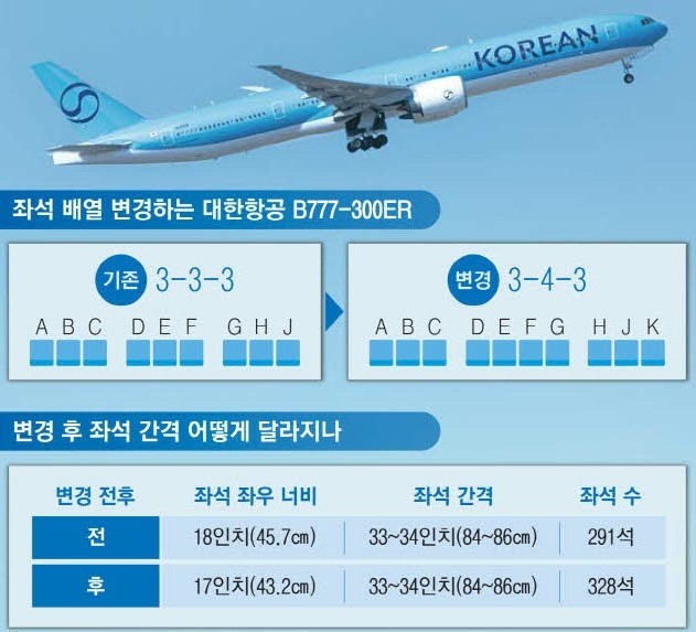 기존 3-3-3 배열과 비교하면 공급석은 늘어나지만 좌석 좌우 간격이 2.6cm 줄어들게 됩니다.