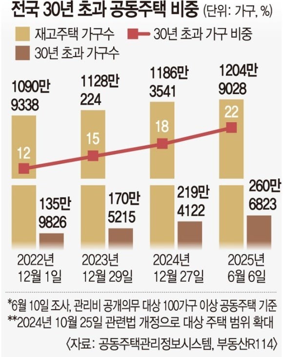 전국 공동주택 5채 중 1채(22%)는 지은 지 30년을 초과한 노후주택. 2022년 12월 1일(12%) 이후 2년 6개월 만에 10% 포인트 상승.