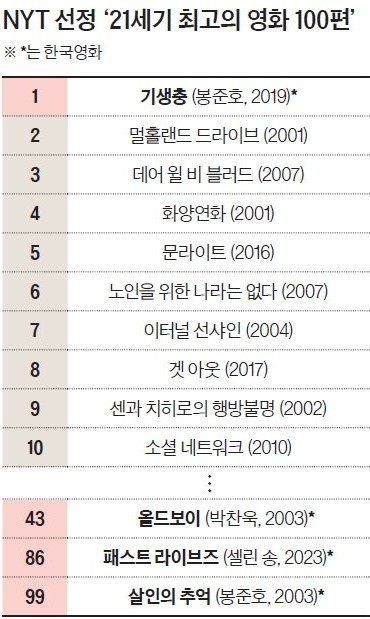 3. '기생충', 뉴욕타임스(NYT) 선정 '21세기 최고의 영화 100편 1위