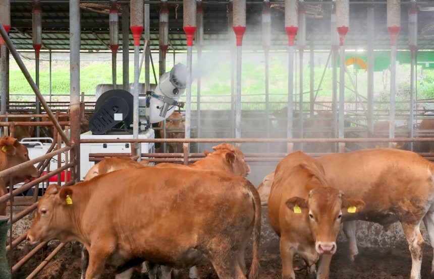 폭염특보가 내려진 30일 광주 북구청동물정책팀 직원들이 충효동의 한 축사에 물을 뿌리며 더위를 식히고 있다. 전남 장성은 이날 오전 폭염경보가 내려졌다./김영근 기자