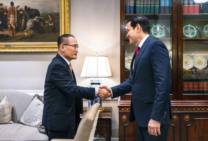 위성락 국가안보실장이 7일(현지시간) 미국 워싱턴DC에서 마코 루비오 미국 국무장관 겸 국가안보보좌관과 만나 악수를 나누고 있다.