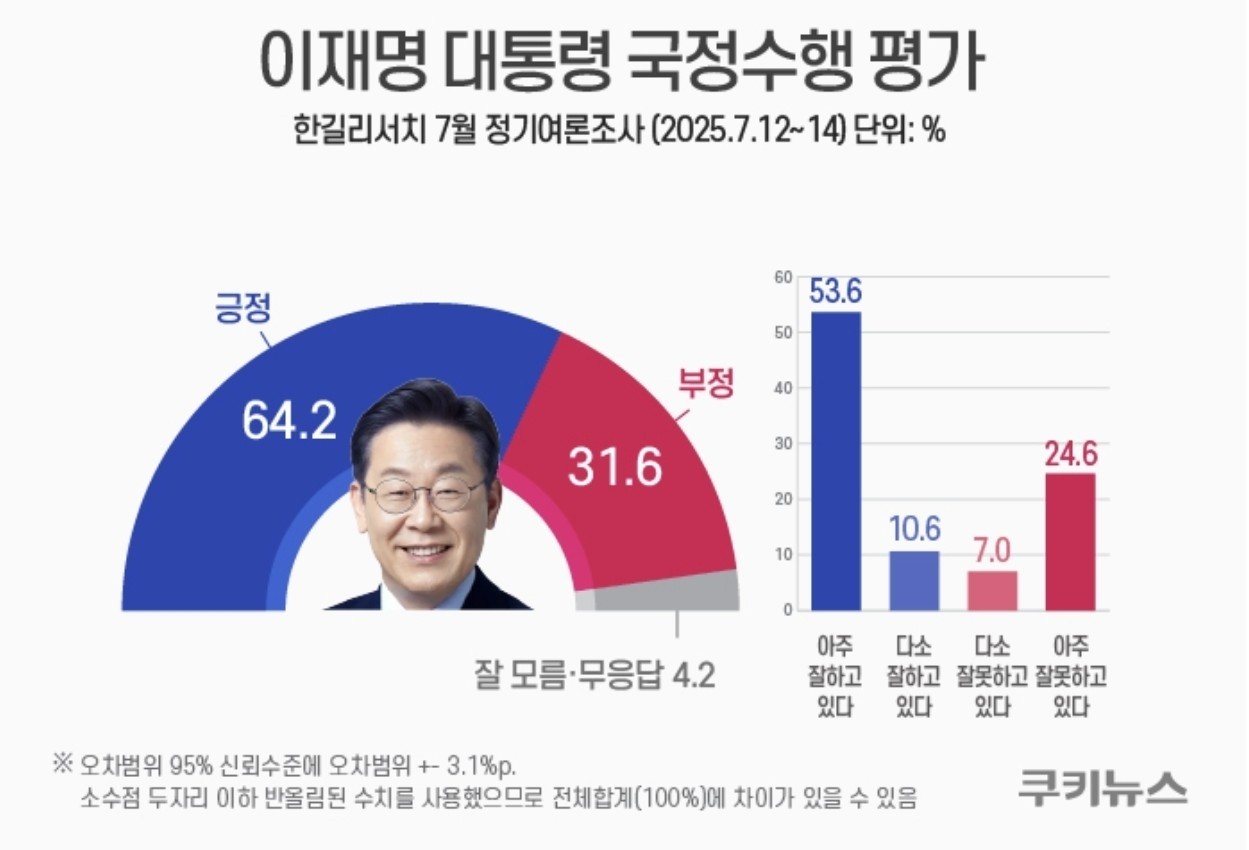 ■ 李대통령 지지율 64.2%…부울경·중도층서도 60%대 긍정평가 [쿠키뉴스 여론조사]