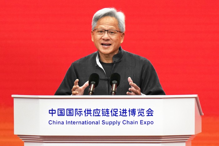 젠슨 황 엔비디아 최고경영자가 16일 중국 베이징에서 열린 제3회 중국 국제공급망촉진박람회 개막식에서 자신의 트레이드마크인 검은색 가죽 재킷 대신 중국 전통의상을 변형한 당복(唐裝)을 입고 연설하고 있다.