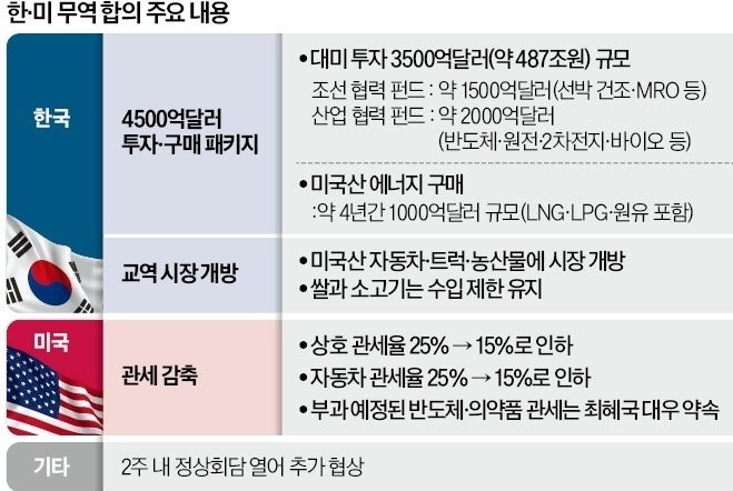 미국은 상호 관세와 자동차 관세를 15%로 인하하기로 했고, 한국은 총 4500억달러 규모 반대급부를 미국에 제공하기로 했습니다.