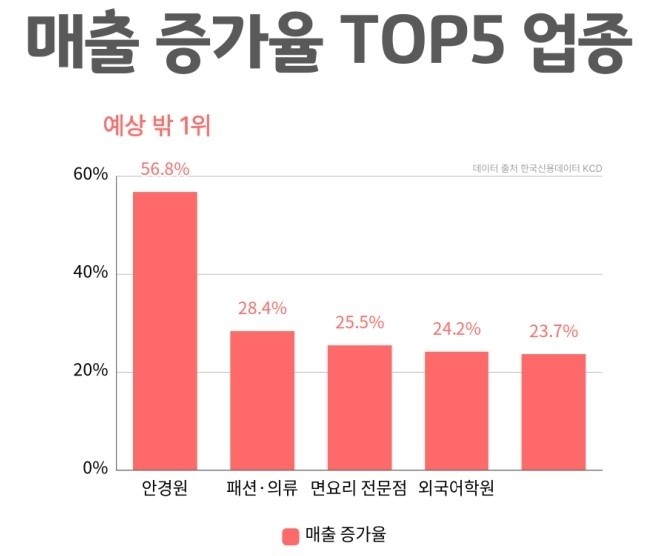 다음으로 패션·의류업(28.4%), 면요리 전문점 (25.5%), 외국어학원(24.2%), 피자(23.7%), 초밥·롤 전문점(22.4%), 미용업(21.2%), 스포츠·레저용품(19.9%) 등도 증가 폭 커.(문화)