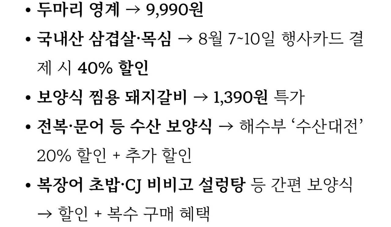 롯데, 이마트 등 유통 업계는 삼계탕 재료, 장어, 전복 등 말복 기획전.