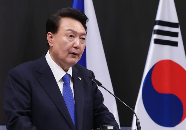 윤석열 대통령이 2024년 9월 20일(현지시간) 프라하 체코 정부청사에서 열린 한·체코 공동언론발표에서 발언하고 있다. 연합뉴스.