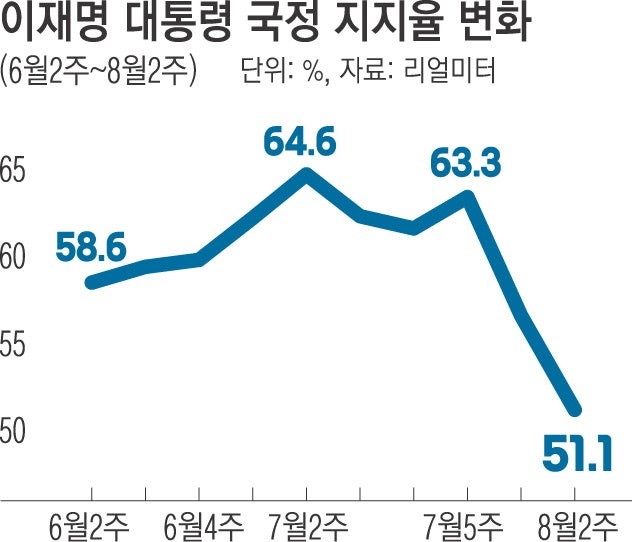 → 대통령 지지도 최근(8월 둘째 주) '51.1%'로 급락.