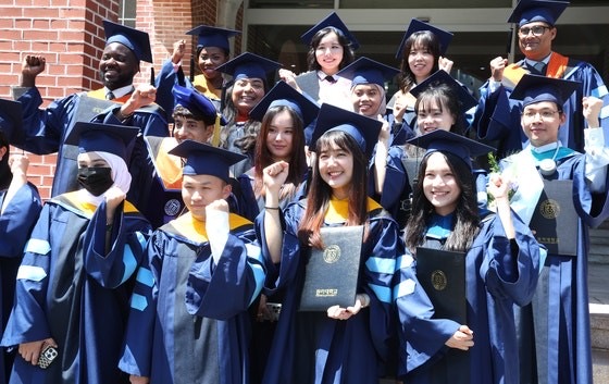 지난달 21일 부산 서구 동아대학교 부민캠퍼스에서 열린 2024학년도 후기 외국인 유학생 졸업환송회에서 식을 마친 외국인 유학생들이 석당박물관 앞에서 기념사진을 찍고 있다. 이번 학기 외국인 유학생 졸업생은 학부 22명 일반대학원 45명 국제전문대학원 7명 등 9개국 74명이다. 연합뉴스