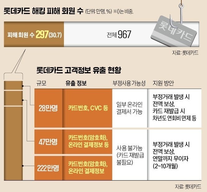 롯데카드에서 전체 고객의 3분의 1에 해당하는 297만명의 정보가 유출된 것으로 확인되며 고객 불안이 커지고 있다.