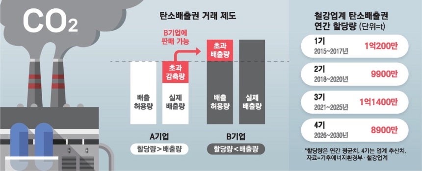 정부가 내년부터 시행할 ‘제4차 배출권 거래제’ 계획에 따라 포스코와 현대제철 등 양대 철강 기업에만 향후 5년간 3조원에 달하는 추가 비용이 발생할 걸로 예상됩니다