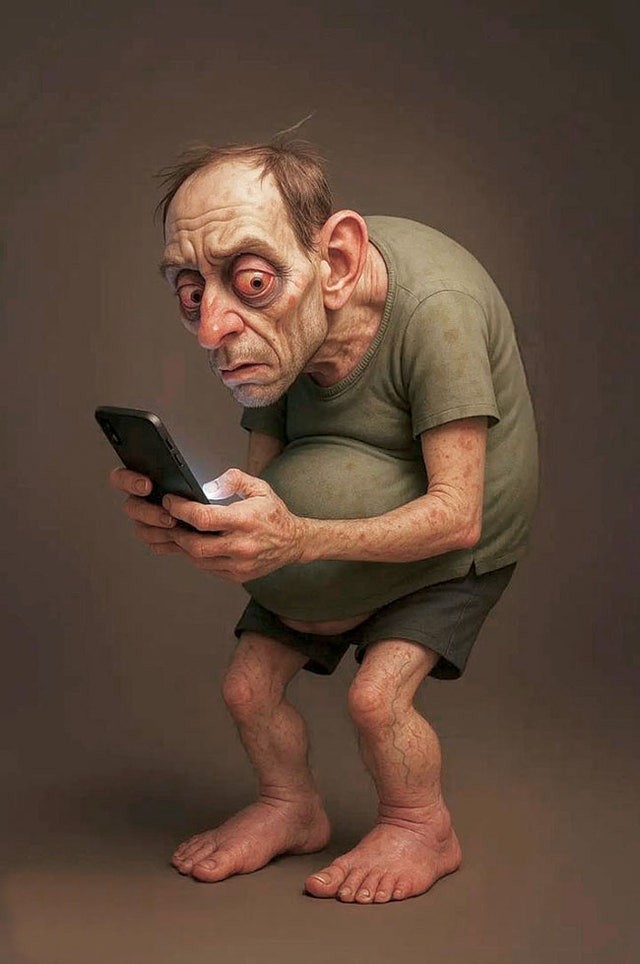 복부비만, 구부정한 자세, 거북 목, 각종 화면에서 방출되는 블루라이트로 피부 노화와 색소침착이 있는 모습 표현.(문화)