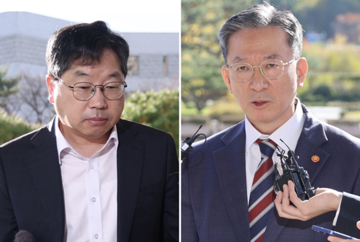 대장동 개발 비리 사건 항소 포기를 두고 검찰 내부에서 거센 반발이 이어지고 있는 가운데 노만석 검찰총장 권한대행이 10일 오전 서울 서초구 대검찰청으로 출근하고 있다. (왼쪽 사진). 이날 정성호 법무부 장관이 정부과천청사 법무부로 출근하며 검찰의 대장동 항소 포기 결정과 관련한 입장을 밝히고 있다. 이승환 기자·뉴스1
