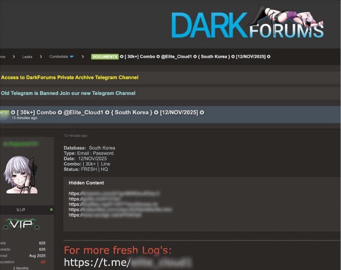 한국인의 이메일과 패스워드 묶음 개인정보 3만개를 판다는 내용이다.