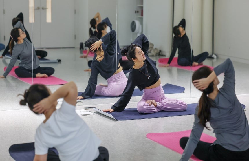 지난달 24일 오전 경기 과천시 건강생활지원센터에서 주민들이 필라테스를 하고 있다. 시가 무료로 운영하는 수업이다. /박성원 기자