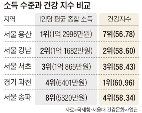 한국의 지역별 건강 지도는 ‘부(富)의 지도’와 상당 부분 일치하는 것으로 나타났다.