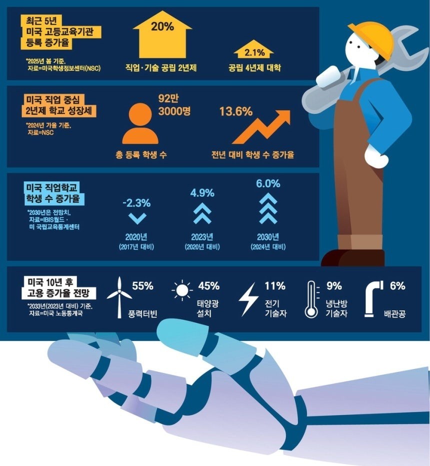 올해 미국에서 테크기업의 채용공고는 3년 전보다 30% 가량 줄어든 반면 같은 기간 미국 직업학교의 용접, 배관, 냉난방공조, 자동차 정비 과정의 등록자 수는 20% 증가했습니다.