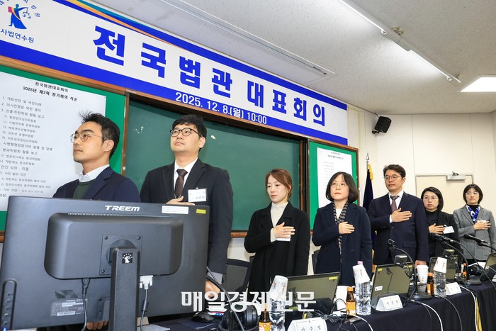 8일 경기 고양시 사법연수원에서 열린 전국법관대표회의에 참석한 대표 판사들이 국민의례를 하고 있다.