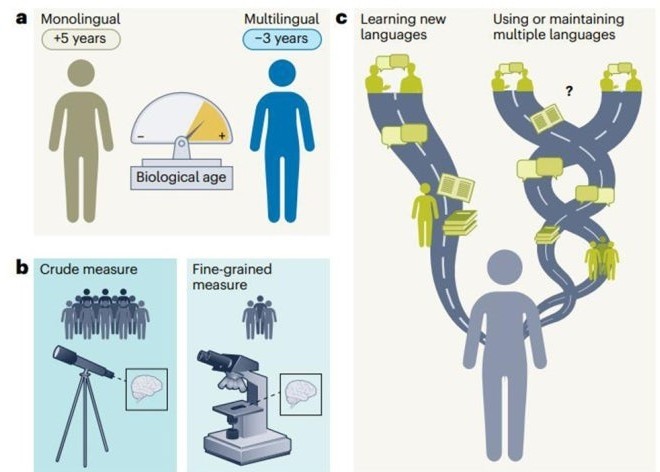 → 일상에서 두 개 이상의 언어를 사용하는 사람들이 단일 언어 사용자보다 생물학적 노화가 더 천천히 진행되는 경향.
