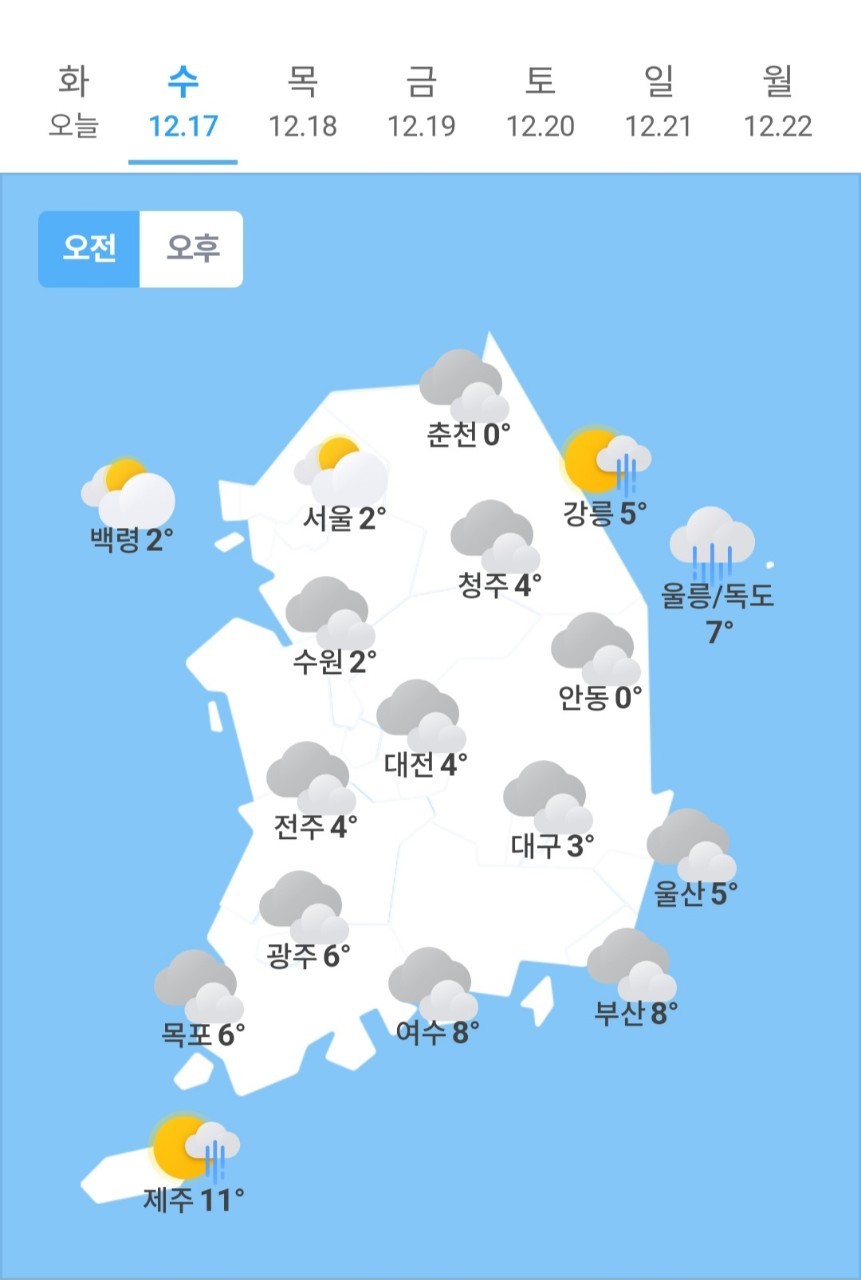 ✫춘천(☁️)➠(☁️) 0℃ ~ 7℃