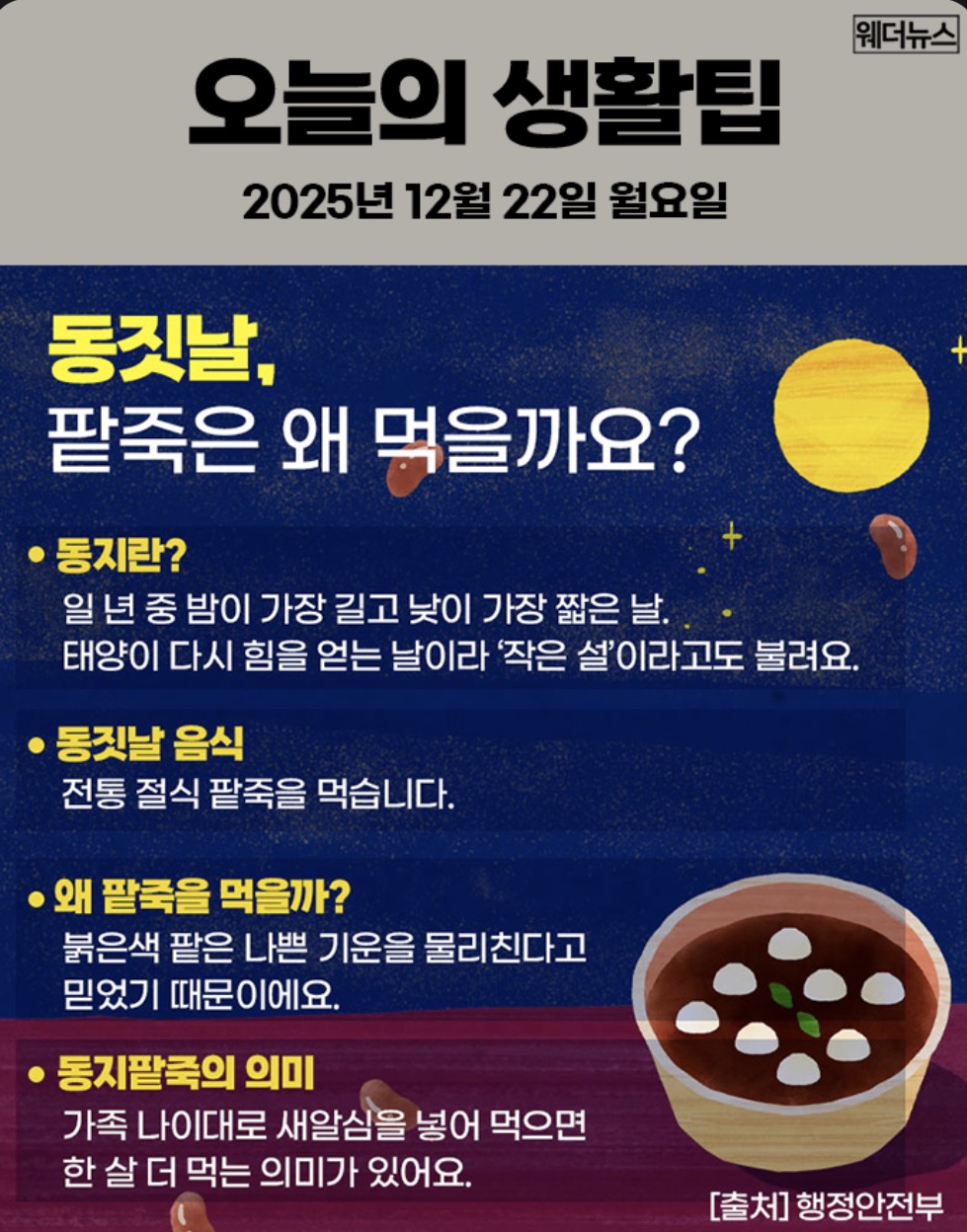 동짓날인 오늘 출근길에는 어제보다 추위가 더 심하겠습니다.현재 기온 대관령 영하 13.4도, 서울 영하 5.1도, 안동도 영하 7.6도로 뚝 떨어져 있습니다.특히 어제보다 기온이 10도 이상 크게 떨어