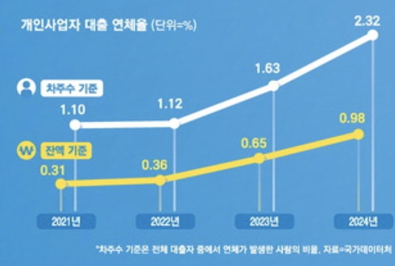 1. 지난해 개인사업자의 대출 연체율이 역대 최고 수준으로 상승했습니다.