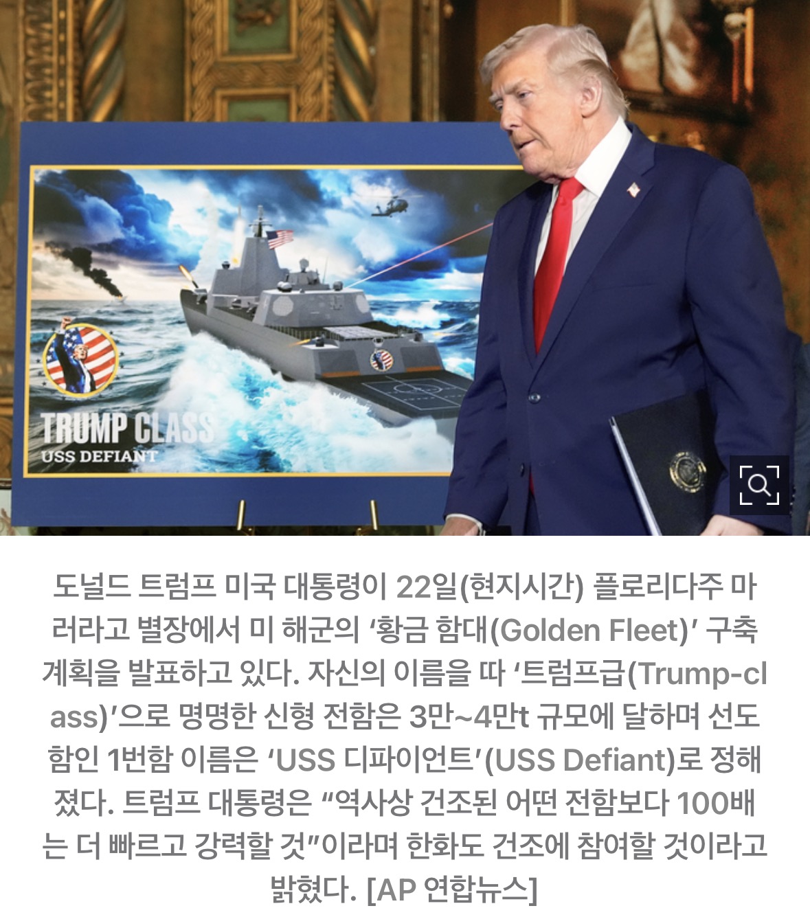 1. 도널드 트럼프 미국 대통령이 미 해군의 ‘황금 함대’ 구상을 발표하면서 이 함대에 편입될 신예 호위함을 한화와 협력해 건조할 예정이라고 밝혔습니다.