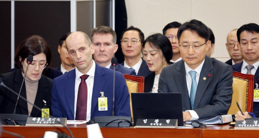해럴드 로저스 쿠팡 임시대표(왼쪽)가 30일 국회에서 열린 '쿠팡 침해사고 및 개인정보 유출, 불공정 거래, 노동환경 실태 파악과 재발 방지 대책 마련을 위한 연석 청문회'에 참석해 청문위원들의 질문을 듣고 있다.