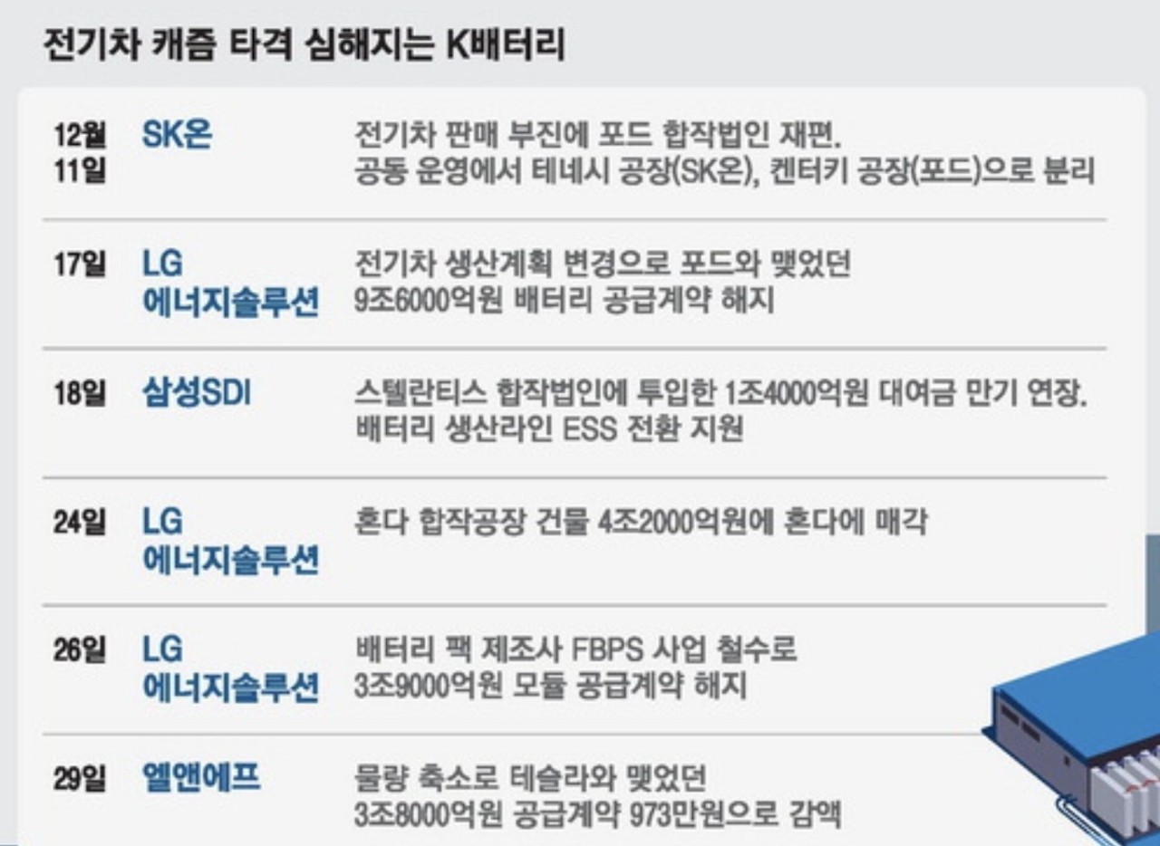 3. 글로벌 전기차 시장이 다시 일시적 수요정체에 직면하면서 국내 배터리 업계가 확보했던 공급 계약이 잇따라 취소되고 있습니다.