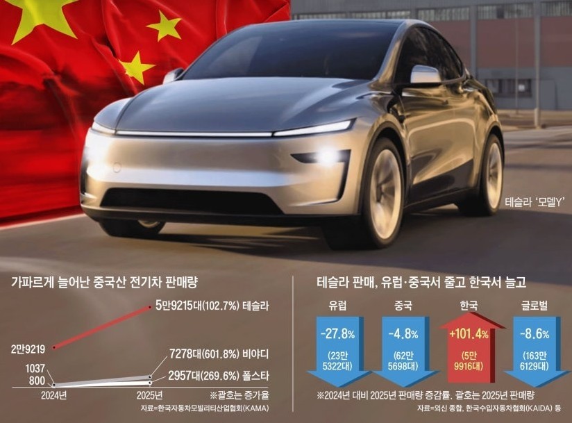 한국 전기차 시장이 중국산 테슬라의 ‘재고떨이 창구’가 되고 있다.