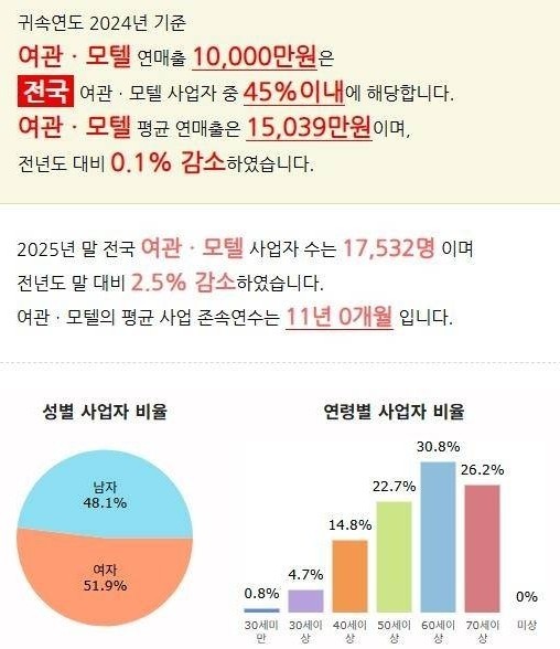 → 국세통계포털에 따르면 전국의 여관·모텔 사업자 수는 코로나19 발생 전인 2019년 2만 939명에서 2025년 11월 기준 1만 7621명으로 15.8% 감소.