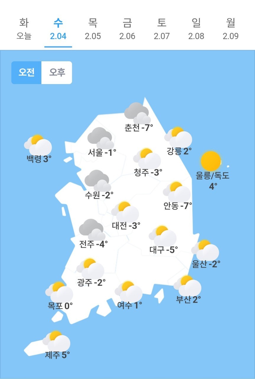 ✫춘천(☁️)➠(☁️) -7℃ ~ 4℃