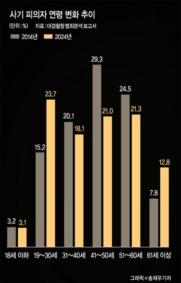 → 전체 사기 범죄에서 2030이 차지하는 비중은 23.7%로 10년새(2014년 15.7%) 8.5%P나 증가.