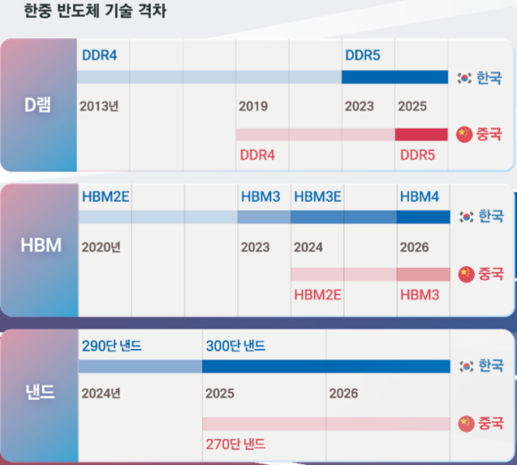 분야별 한국이 1~3년 앞서. 낸드는 韓과 1년차 따라붙어. 특히 YMTC(양쯔메모리)는 낸드를 400단 이상으로 단수를 높일 때 사용하는 하이브리드 본딩 특허를 가지고 있다. 삼성전자와 SK하이닉스도 이 기술을 사용하려면 YMTC에 특허료를 지불해야 한다.(매경)▼