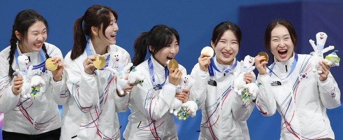 19일(한국시간) 이탈리아 밀라노 아이스스케이팅 아레나에서 열린 ‘2026 밀라노-코르티나담페초 동계올림픽’ 쇼트트랙 여자 3000m 계주 결승에서 금메달을 따낸 심석희, 노도희, 이소연, 김길리, 최민정(왼쪽부터)이 메달을 손에 들고 환하게 웃고 있다.