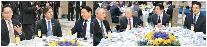 왼쪽부터 이재용 삼성전자 회장, 프레데리쿠 시케이라 필류 브라질 통신부 장관, 최태원 SK그룹 회장 겸 대한상공회의소 회장, 정의선 현대차그룹 회장, 손경식 CJ그룹 회장 겸 한국경영자총협회장, 정기선 HD현대 회장, 구광모 LG그룹 회장. 김호영 기자·연합뉴스