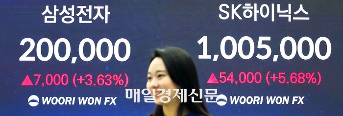 이날 코스피는 각각 20만원과 100만원 선을 돌파한 삼성전자와 SK하이닉스의 주가 동반 강세에 힘입어 전일 대비 2.11% 오른 5969.64로 마감했다. [한주형 기자]