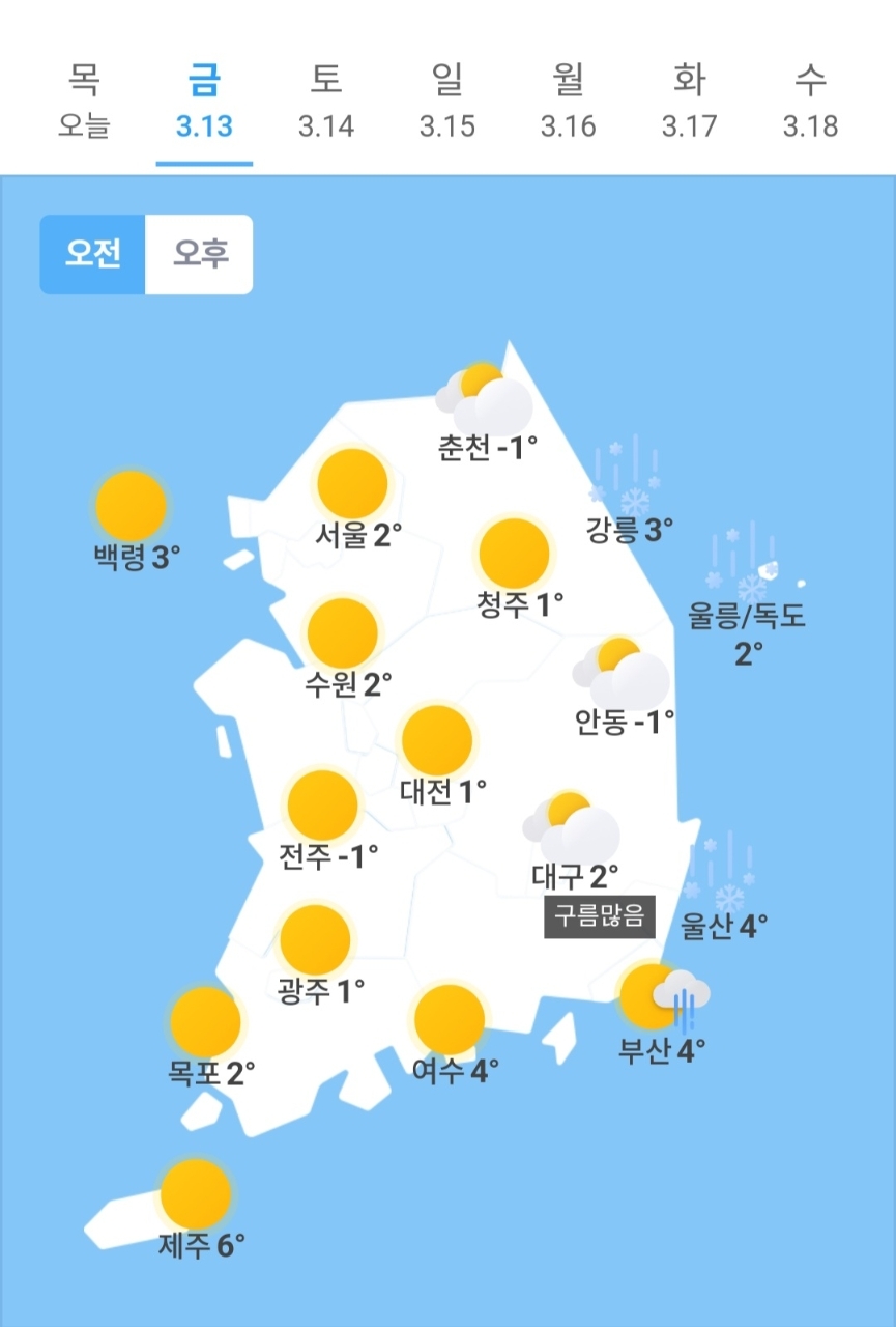 ✫춘천(⛅)➠(☁️) -1℃ ~ 11℃