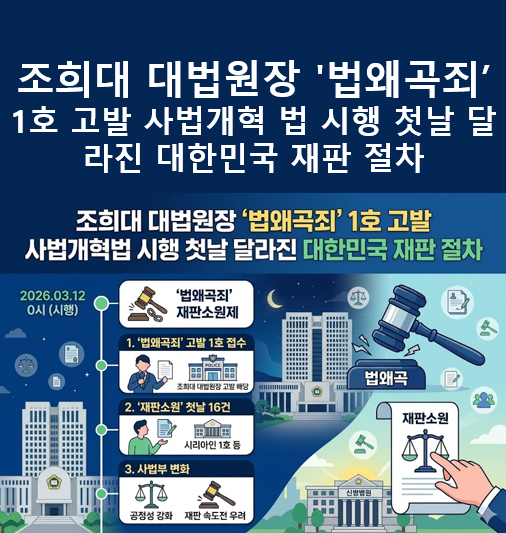 4. 더불어민주당이 강행한 ‘사법제도 개편 3법’이 12일 0시부터 시행된 가운데 조희대 대법원장과 박영재 대법관이 법왜곡죄에 따른 1호 피고발자가 됐습니다.