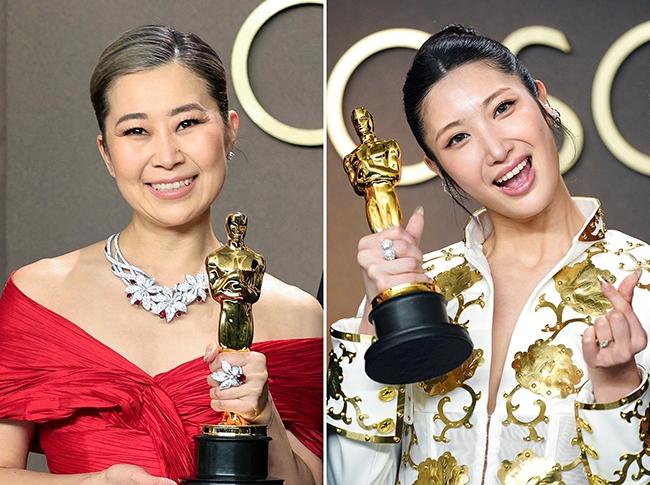 ‘케데헌’을 연출한 매기 강 감독(왼쪽)과 ‘골든’의 작사 작곡가이자 ‘골든’을 직접 부른 가수 이재. [AP연합뉴스]