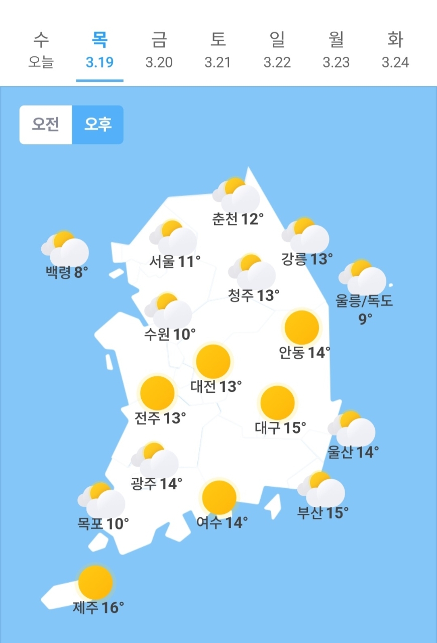 ✫대전(⛅)➠(☀️) 0℃ ~ 13℃