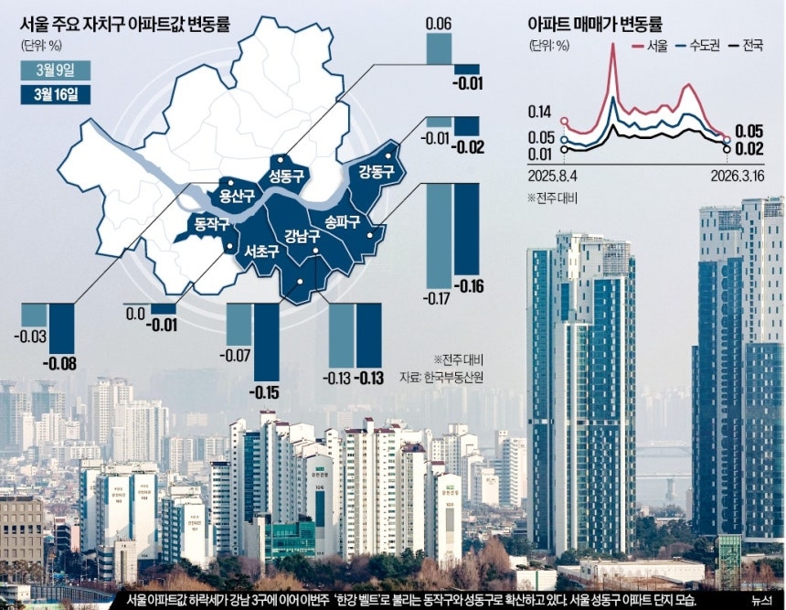 3. 서울 강남3구와 용산구, 강동구에 이어 성동구와 동작구 아파트값이 하락세로 돌아서며 서울 주택시장 매매가격 상승 폭이 7주 연속으로 둔화됐습니다.
