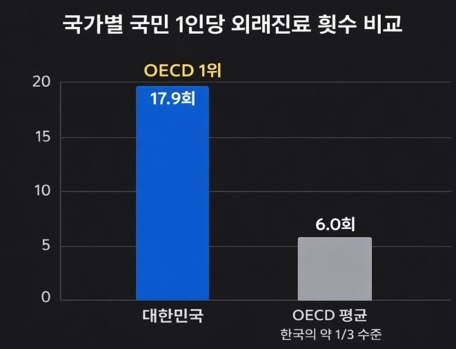 → 한국인, 1인당 연간 병원 외래진료 횟수 17.9회로 OECD 1위(한의사 포함·치과의사 제외)...