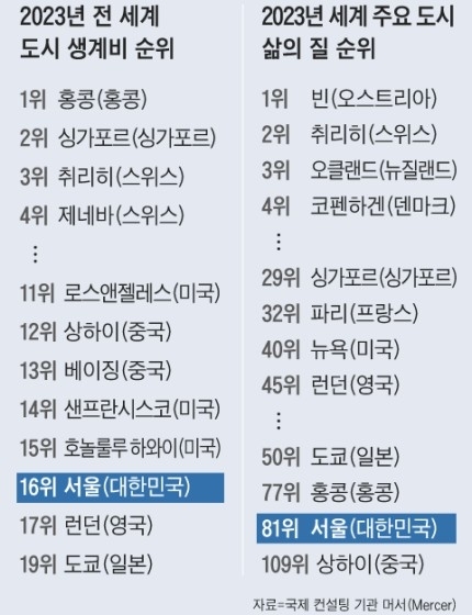 7. 서울 생계비, 런던·도쿄보다 비싸… 삶의 질은 81위