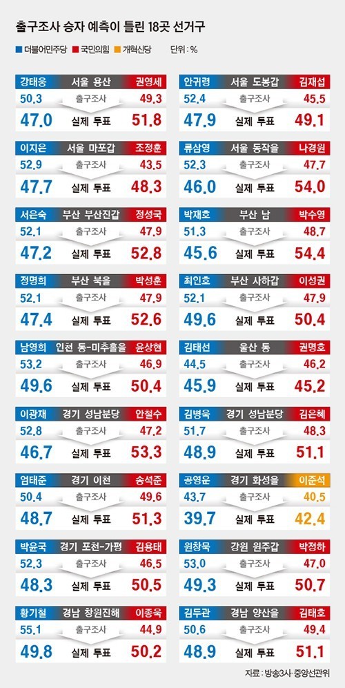 3. 출구조사 틀린 지역구 18곳 → 이 중 17곳이 민주당 승리 예측. 그러나 실제 개표 결과는 국민의힘 승리 16곳, 개혁신당 1곳 승리. 국민의힘 승리로 예측 됐지만 민주당이 승리한 곳은 1곳. 여권 후보는 과소 예측하고 야권 후보는 과대 예측하는 양상을 보였다.(중앙선데이)▼
