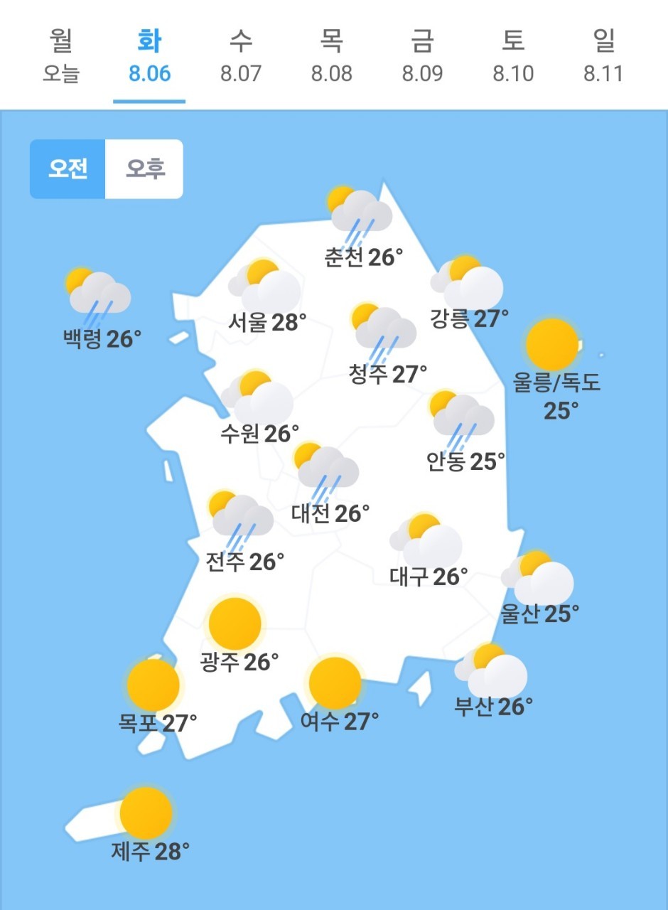 오늘의🌞☔️☃️ 날씨, 2024년 8월 6일 화요일