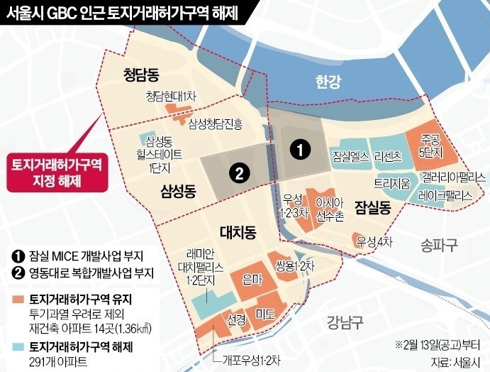 서울시가 13일부터 잠실·삼성·대치·청담동 등 국제교류복합지구(GBC) 인근 기존 아파트의 토지거래허가구역 지정을 해제한다.