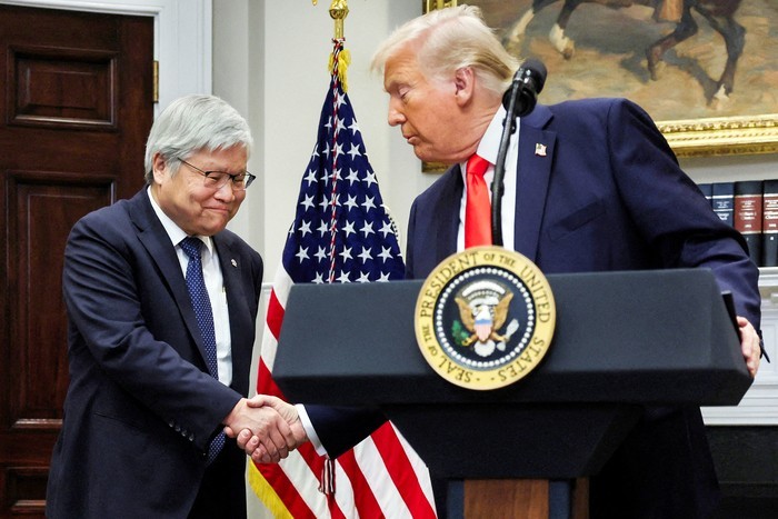 도널드 트럼프 미국 대통령(오른쪽)이 3일(현지시간) 워싱턴DC 백악관 루즈벨트룸에서 대만 반도체 기업 TSMC의 웨이저자 회장과 악수하고 있다. 웨이 회장은 이날 기자회견을 통해 미국 내 반도체 공장에 1000억달러(약 146조원)를 투자하겠다고 밝혔다. [로이터연합뉴스]